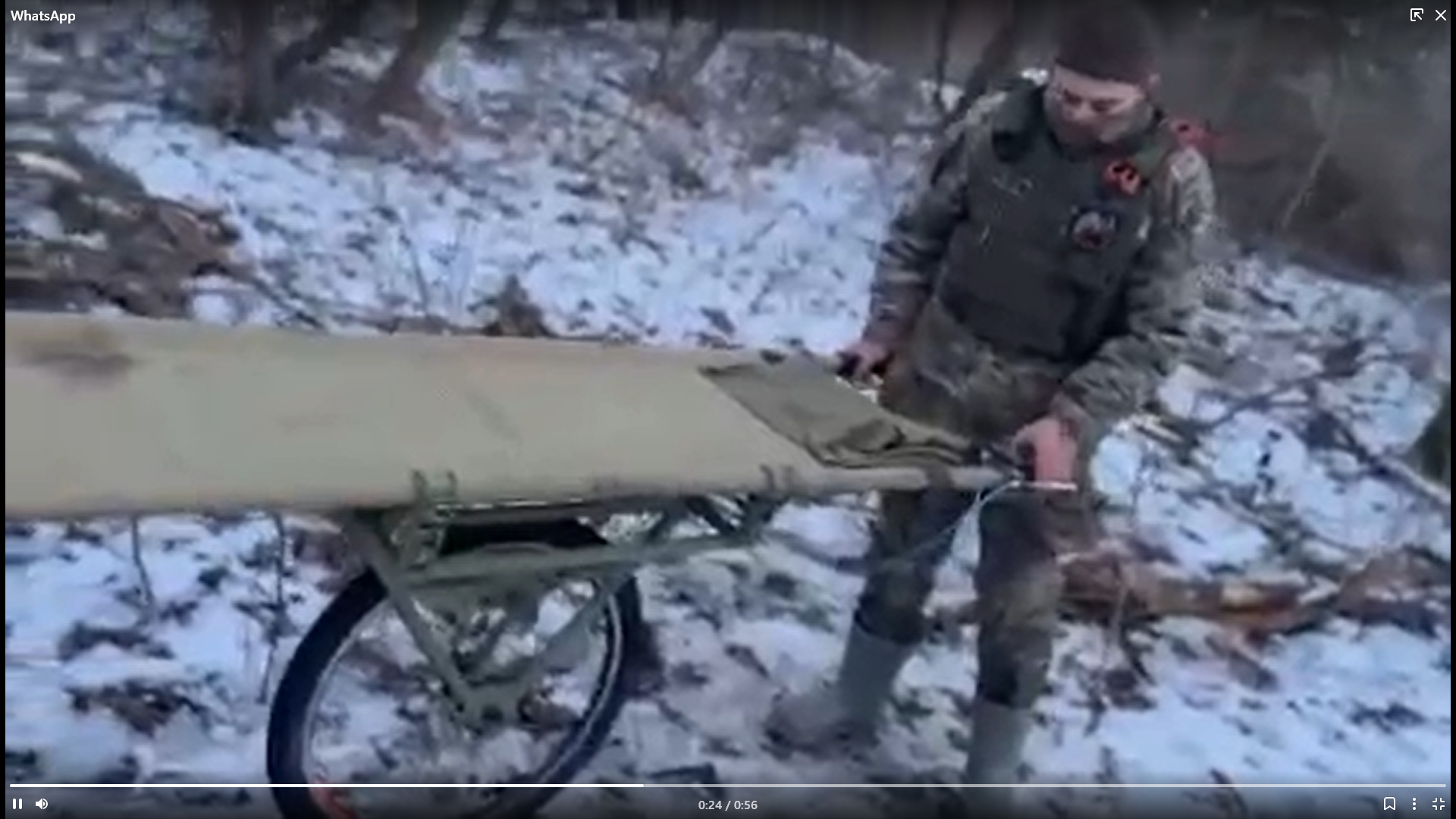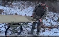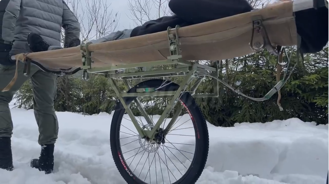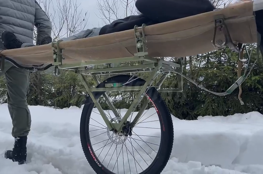 Тележка поставлена на одно колесо, что повышает ее маневренность и проходимость по бездорожью, плюс к тому оно легко складывается, когда группе эвакуации нужно залечь при обстреле или пронести носилки через препятствие.