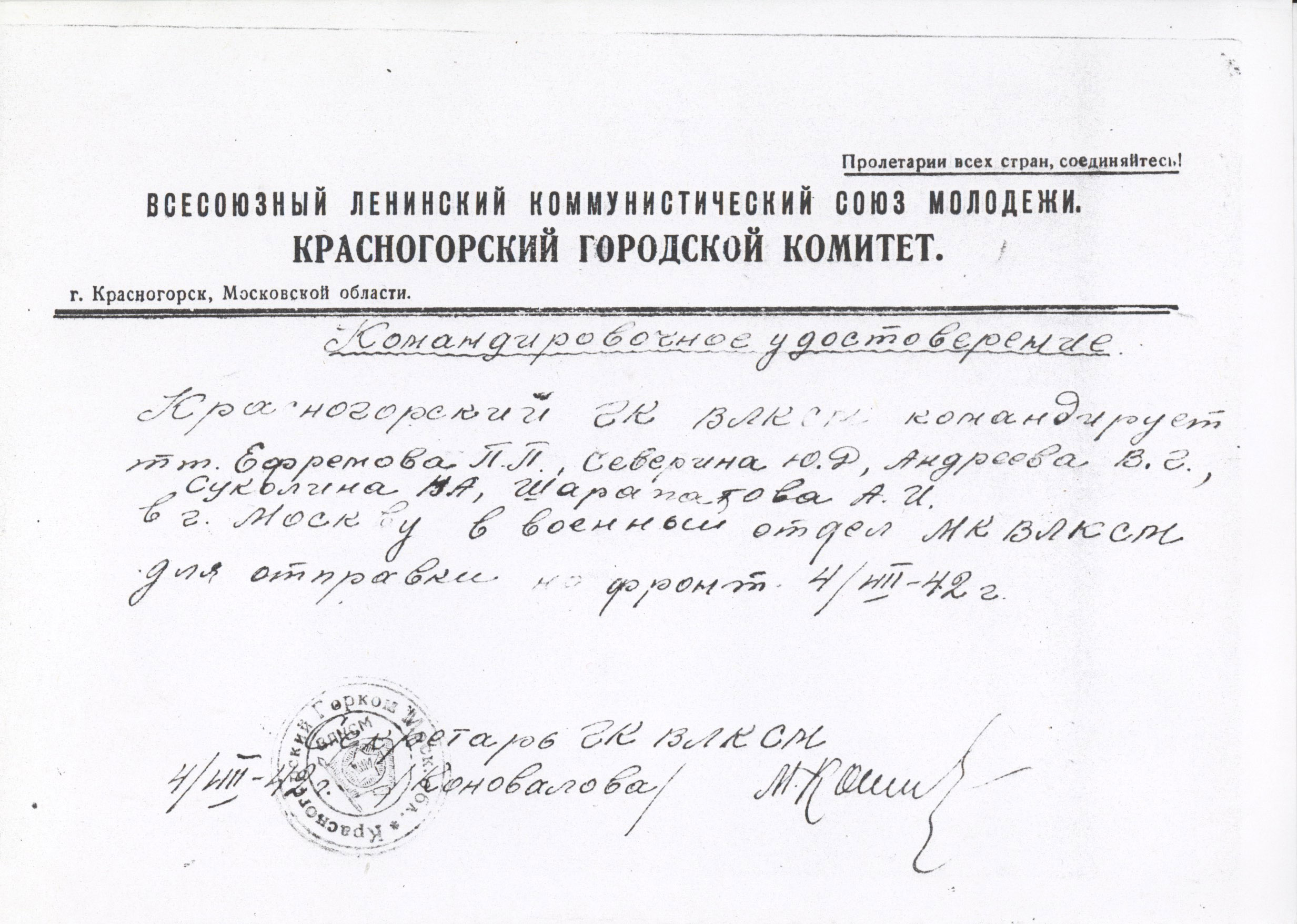 В горкоме ребят усадили за столы и накормили. Впервые с начала войны они досыта поели - время было голодное. Выдали каждому по целому батону хлеба и комсомольскую путевку на фронт – одну на пятерых.